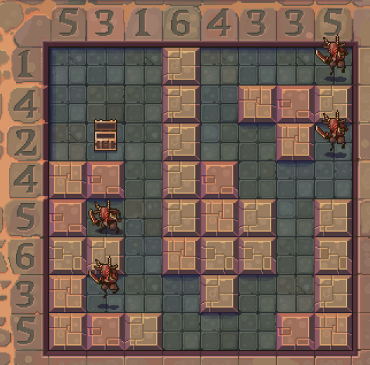 One game I can think of being very similar, is a game within a game. Dungeons & Diagrams puzzle within Last Call BBS [0]. In that game you can place or remove walls for them to add up to the numbers shown per row/column. That game has another layer of strategy built on top, as there are certain "dungeon patterns" you could observe that would in theory guide you through completion. I myself haven't noticed any patterns when I've tried the game the first time, and just relied on the numbers shown. (Guess that's why I've only played 3-4 levels)
